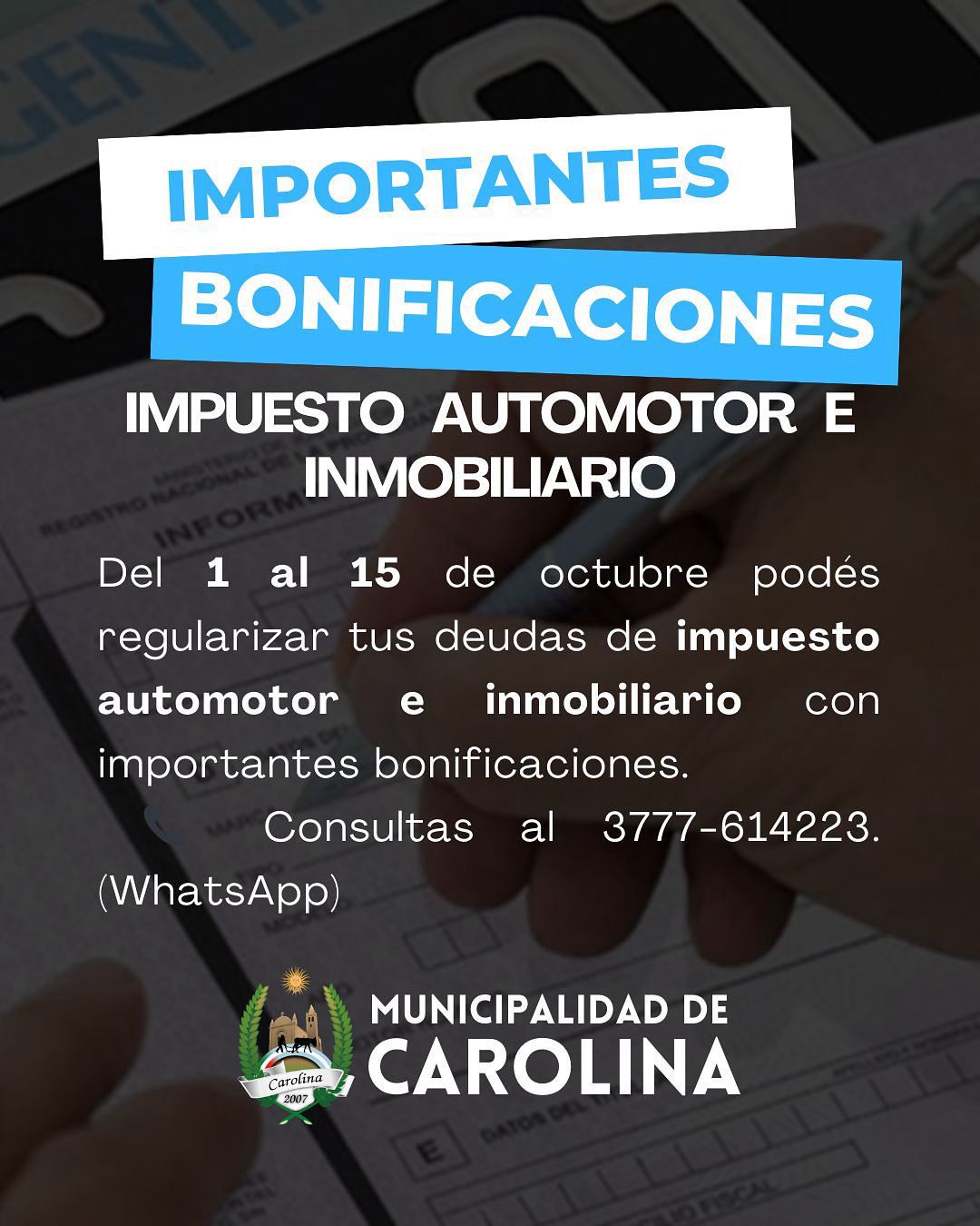 La Municipalidad de Carolina está prorrogando hasta el 31 de octubre el plazo para regularizar las deudas de impuesto automotor e inmobiliario. Esto se hace con importantes bonificaciones.
