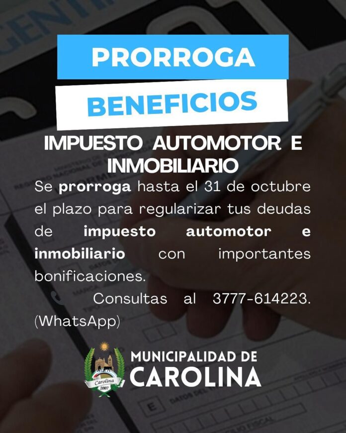la Municipalidad de Carolina está otorgando una prórroga hasta el 31 de octubre para que los contribuyentes regularicen sus deudas del impuesto automotor e impuesto inmobiliario.