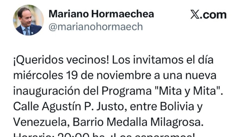 Con un mensaje cercano, el intendente extendió una invitación abierta a toda la ciudadanía: “Queridos vecinos, los invitamos este miércoles 19 de noviembre a una nueva inauguración del Programa Mita y Mita. Será en la calle Agustín P. Justo, entre Bolivia y Venezuela, en el barrio Medalla Milagrosa. Los esperamos a las 20 horas”.