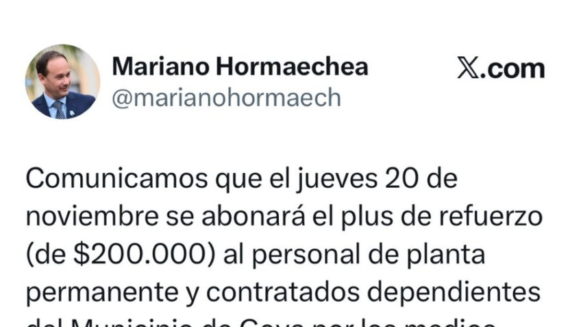 En su comunicado oficial, Mariano Hormaechea expresó: “Comunicamos que el jueves 20 de noviembre se abonará el Plus de Refuerzo (de $200.000, oo) al personal de planta permanente y contratados dependientes del Municipio de Goya por los medios habituales de pago”. El anuncio generó una amplia repercusión en redes sociales, donde numerosos empleados valoraron la claridad de la información y el compromiso de la gestión municipal.